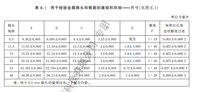 (2)表E.1 用于检验金属锥头和锥套的塞规和环规尺寸