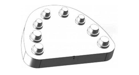 1.牙颌模型三维扫描仪精度测试标准模型样件几何形态上由8个圆锥台和1个底座构成,8个圆锥台按牙弓曲线从小到大对称分布,圆锥台不同大小用于模拟基牙的不同大小;