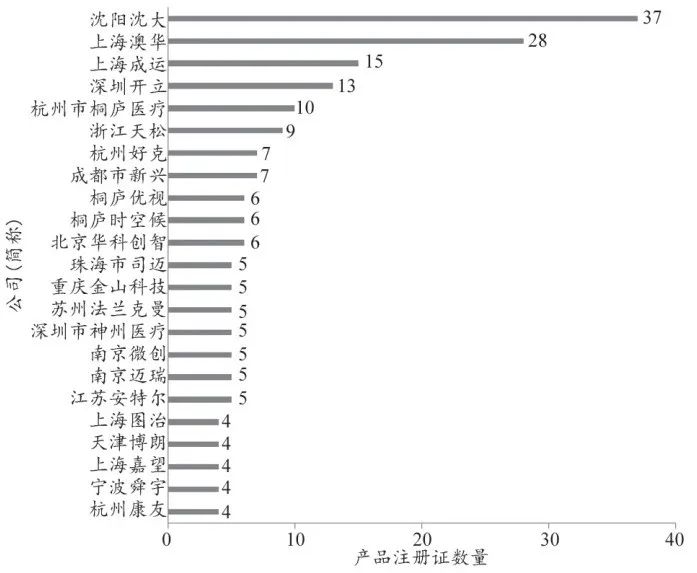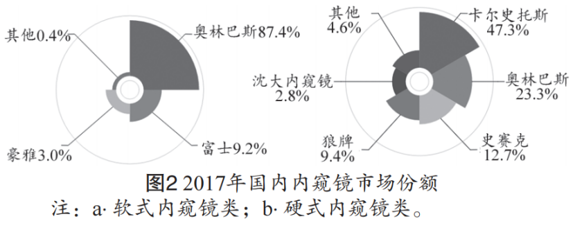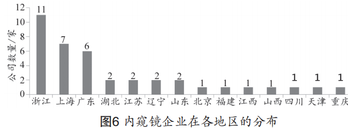 医用内窥镜是一种集图像传感器、光学镜头、光源照明、机械装置等于一体的设备,可经人体自然孔道或表层穿孔插入体内,直接观察人体体腔和内脏器官的组织形态和病变部位,辅助疾病的诊断或治疗 [1-4]。基于内窥镜的微创医疗技术是目前消化、呼吸、泌尿、耳鼻喉等系统疾病诊断、治疗不可缺少的技术,具有创伤小,手术时间短,术后康复快等特点,在多个医疗科室的应用十分广泛 [5-12]。近年来,国产医用内窥镜制造企业通过技术吸收和自主研发,开发了一系列具有自主知识产权的医用内窥镜产品,性能及质量与国际大企业之间的差距正在逐渐缩小,在个别领域甚至处于领先地位 [13-15]。但据中国医疗器械行业数据,2017 年国内软式、硬式内窥镜市场仍以国外品牌为主,市场份额占比超过 8 成 [16]。为加快推进我国医疗器械领域创新链与产业链的整合,推动国产医疗装备技术提升,促进国产医疗器械,特别是医用内窥镜的优化配置及推广,打破欧美公司长期以来对我国医用内窥镜市场的垄断。本文从国产内窥镜及配套医疗器械产品注册证着手,分析了 2007 年至 2018 年间,国产医用内窥镜的产品类型、注册量趋势及生产企业分布等情况,以期提供科学、具体和全面的国产内窥镜产业评估 , 帮助内窥镜行业从业人员及医疗机构医疗设备管理人员深入了解国产内窥镜行业现状及国产内窥镜产品情况。国内医疗器械行业起步相对较晚,但随着国民经济的高速发展及人民群众健康需求的不断增加,我国医疗器械行业发展迅速。据中国医药物资协会统计,国内医疗器械市场规模从 2001 年的 179 亿元增长至 2016 年的 3700 亿元,年均复合增长率约 20.8%,大幅领先全球医疗器械市场增速 [16]。其中,医用内窥镜产业的市场规模从 2006 年的 21.48 亿元增长至 2015 的 156.15 亿元,十年年均复合增长率约 24.7%,增速高于国内医疗器械市场的平均增速,并逐步形成了以内窥镜为主,配套器械如微创手术器械、摄像系统、成像系统、冷光源等为辅的广阔市场 [17-20]。2006~2015 年国内内窥镜市场规模,见图 1[16]。据中国医疗器械行业数据显示,2017 年国内软式内窥镜市场,奥林巴斯以 87.4% 的市场份额大幅领先其余厂商;硬式内窥镜市场,卡尔史托斯以 47.3% 的市场份额居首,奥林巴斯、史赛克、狼牌分布占据 23.3%、12.7% 和 9.4%的份额,国内企业沈阳沈大内窥镜以 2.8% 的份额位列第五 [16]。2017 年国内内窥镜市场份额,见图 2[13]。2018 年6月,以“内窥镜”为关键词,在原国家食品 药品监督管理总局(CFDA)官网的数据查询栏目(http:// app1.sfda.gov.cn/datasearch/face3/dir.html)检索国产内窥镜及配套医疗器械注册证信息。在剔除检索结果中的重复项(即同一产品注册信息更新文件)后,对国产内窥镜及配套医疗器械进行了总体分析。重点筛选了2018年6月1 日之后仍有效的产品注册证(以下简称有效注册证),分析有效注册证所属企业情况,并对软镜、硬镜、胶囊镜、纤维镜这 4 类内窥镜的生产企业开展了数据分析。在国产医疗器械目录中共检索到824条产品注册证记录,剔除重复项后共有816条有效数据。注册产品类别及相应数量分布,见图 3 所示,其中,排在前 5 位的注册产品类别分别是硬镜、冷光源、一次性医用耗材、软镜、摄像系统。在时间分布上,2007 年至 2017 年,产品注册证数量2 项增长至 137 项,涨幅近 70 倍,且逐年呈波浪形上升(图 4)。2010、2014、2017 年获批注册证数量达阶段性峰值,分别为 99、115、137 项。经分析,确认截至2018年6 月1月,医用内窥镜类有效注册证共392项,分属于164家企业(去除同一企业不同时期不同名字项)。有效注册证中软镜、硬镜、胶囊镜、纤维镜类产品注册证分别有45、45、5、3项,适用身体部位不同但有部分交叉(表 1)。内窥镜产品注册证数量与适用部位相关,软镜主要用于消化道疾病诊查,硬镜主要应用于腹腔、关节、五官、泌尿系统、生殖系统等 [17-19],因此相应部位的产品注册证数量相应较多。拥有内窥镜类产品注册证数量大于等于 4 项的企业及其产品注册证数量分布如图 5 所示。由图 5 可见,沈阳沈大、上海澳华是注册产品数量最多的两家企业,且远高于其他企业。上海成运、深圳开立、杭州市桐庐医疗、浙江天松、杭州好克、成都市新兴、桐庐优视、桐庐时空候、北京华科创智产品注册证数量亦位居前列。拥有有效内窥镜(软镜、硬镜、纤维镜、胶囊镜)注册证的企业共 39 家,分散在全国各地(图 6)。浙江、上海、广东地区分别有内窥镜企业 11、7、6家,占总企业数的 61.5% 左右。各地区生产的内窥镜产品类别及相关注册证数量分布见表2。产品注册证主要集中在浙江、上海、辽宁地区,分别有 29、28、14 项。浙江和辽宁地区以生产硬镜为主,上海以软镜为主。数据显示,国产医用内窥镜整体行业发展迅速,态势良好,一定程度上反映了微创手术的进步与普及。十年间,注册产品数量提高近 70 倍,呈现波浪形上升趋势。注册证数量在2010、2014、2017年达阶段性峰值,这与内窥镜及其配套医疗器械产品的研发周期密切相关。医用内窥镜及配套医疗器械协同发展效应明显。冷光源、一次性医用耗材等配套器械产品的注册证数量占比超过 70%。硬镜的注册证数量比软镜高出约 50%,这与硬镜适用的微创手术多于软镜类产品密切相关。从企业分布看,浙江、上海、广东三省的内窥镜企业数量多,集中度高。