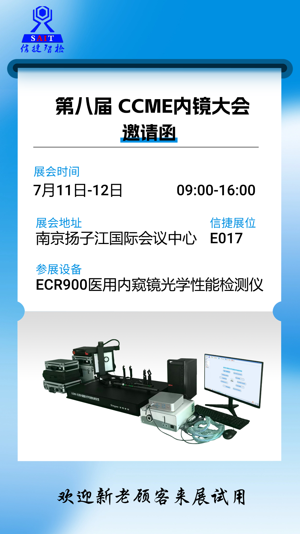 西安信捷诚邀您参加中国南京7月11日-12日第八届CCME内镜展会。我公司展位E017,ECR900医用内窥镜光学性能检测仪将亮相本次展会 ,该产品依据《YY0068.1-2008医用内窥镜 硬性内窥镜 第1部分:光学性能及测试方法》、《YY1298-2016医用内窥镜胶囊内窥镜》、《YY/T 1028-2023医用内窥镜 纤维内窥镜》、《YY/T1587-2018医用内窥镜 电子内窥镜》、《GB 9706.218-2021第2-18部分:内窥镜设备的基本安全和基本性能专用要求》和ISO 8600等标准,主要用于对各种类型内窥镜光学性能进行相关检测。