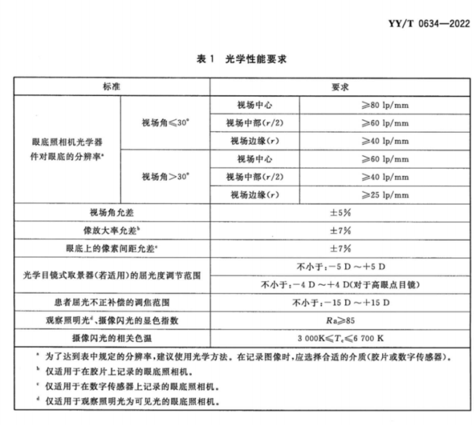 YY/T0634-2022标准中光学性能要求见表1,性能要求:眼底照相机光学器件对眼底的分辨率要求;视场角允差;相放大率允差;光学目镜式取景器(若适用)的屈光度调节范围;观察照明光、摄像闪光的显色指数;摄像闪光的相关色温。