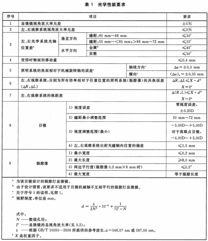 YY 0065-2016《眼科仪器 裂隙灯显微镜》中裂隙灯显微镜光学性能要求见表1:
