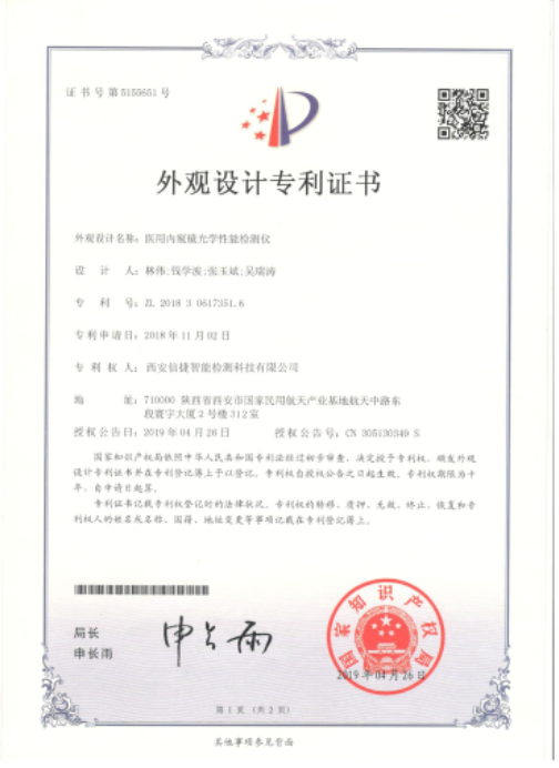 近日,从国家版权局和国家知识产权局传来喜讯,我公司研发的"一种球面模拟装置"和“‘一种用于内窥镜检测仪的初始原点定位机构’”获得实用新型专利证书,“医用内窥镜光学性能检测仪”获得外观设计专利证书,“‘医用内窥镜光学性能检测软件V4.1’”获得计算机软件著作权证书。目前,公司所拥有的新型专利证书有20多项。